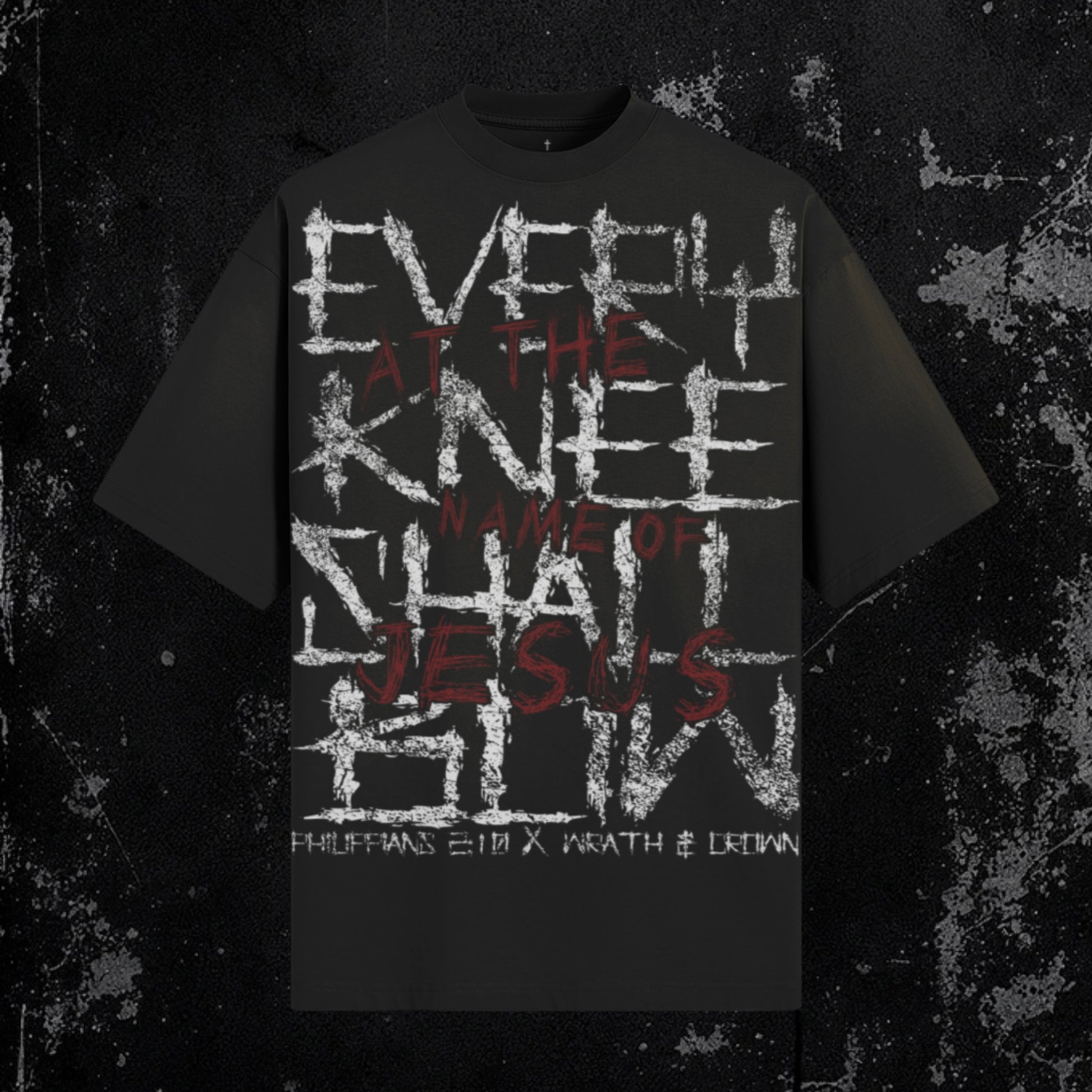 This piece was created as a declaration — not of suggestion, but of certainty. Philippians 2:10 speaks of a moment no one escapes. Every knee will bow. Not some. Not most. All. Kings, idols, pride, and flesh brought low before the name above every name. This garment carries that truth in weight, authority, and form.